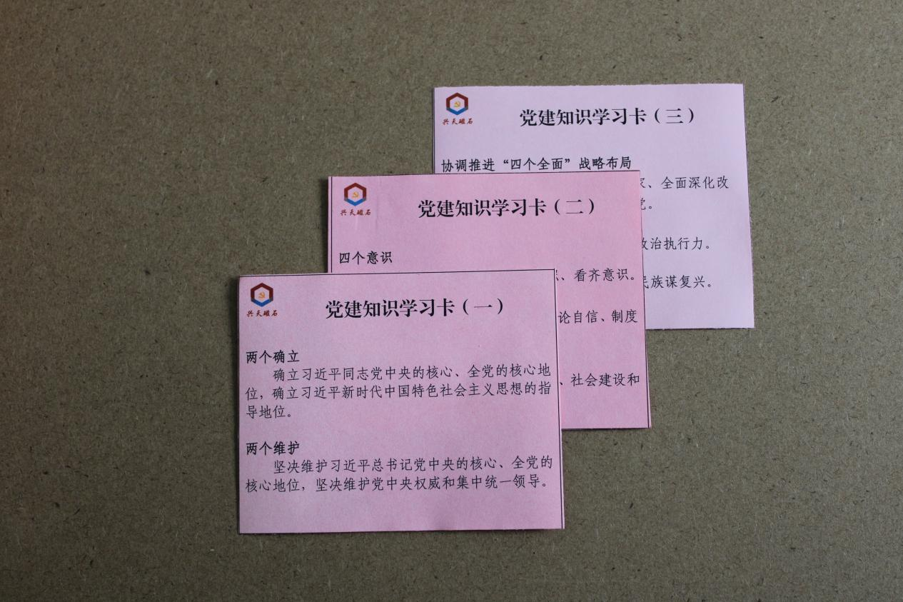 為深入學(xué)習(xí)貫徹習(xí)近平新時(shí)代中國(guó)特色社會(huì)主義思想,進(jìn)一步深化理論學(xué)習(xí),興天礦業(yè)黨支部積極創(chuàng)新形式,設(shè)計(jì)并印發(fā)“黨建知識(shí)學(xué)習(xí)卡”,切實(shí)提升學(xué)習(xí)實(shí)效。