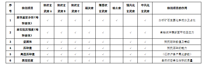(6)招標范圍及內(nèi)容:對諭興礦礦區(qū)南側(cè)+5m以上8種玄武巖原石檢測(檢測項目具體如下表)。檢測成果需滿足國家法律法規(guī)、行業(yè)檢測標準,提供技術(shù)咨詢服務與集料破碎。